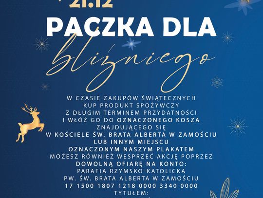 Dodajmy, że akcja "Paczka dla bliźniego" trwa do 18 grudnia. Do tego czasu można przynosić produkty o długim terminie przydatności, chemię czy zabawki w dobrym stanie. Dary należy składać do kosza, który znajduje się przy bocznym wejściu w kościele parafialnym.