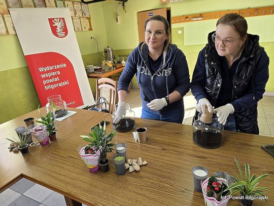 Uczestnicy spotkania przygotowywali miniaturowe ogrody zamknięte w szklanych naczyniach. Powstały zarówno gęste, leśne aranżacje, jak i nowoczesne, minimalistyczne kompozycje. Warsztaty były okazją nie tylko do rozwijania zdolności manualnych, ale także do wspólnego spędzenia czasu i budowania relacji sąsiedzkich.